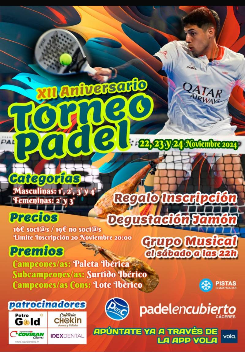El primer club cubierto en Cáceres y con las Instalaciones totalmente climatizadas y primera pista Panorámica en Extremadura, ¡increible!, ven a probarla te gustara. 5 pistas PROFESIONALES DOBLES ( 4 pistas dobles interiores + 1 pista doble El primer club cubierto en Cáceres y con las Instalaciones totalmente climatizadas y primera pista Panorámica en Extremadura, ¡increible!, ven a probarla te gustara. 5 pistas PROFESIONALES DOBLES ( 4 pistas dobles interiores + 1 pista doble exterior) El Club Pádel en Cubierto Cáceres somos un grupo de amigos que nos une una pasión, el Pádel. Desde padelencubierto.com queremos invitaros a tod@s l@s "padeladict@s" de España a utilizar nuestra página libremente para cualquier tema que tenga relación con el Pádel, ya sea para comentar torneos, montar partidos, clases de Pádel o cualquier otra actividad alrededor de nuestro deporte. * Zona de relax climatizada * Zona wifi * Vestuarios completos totalmente climatizados. * Sistemas de reservas on-line (www.padelencubierto.com) * Ranking por niveles * Organización de partidos por niveles. ¿Quieres jugar? ¿Te faltan compañer@s? No te quedes con las ganas, regístrate en wwww.padelencubierto.com y bien puedes reservar la pista completa si estáis 4 jugadores/as, o tenéis la opción de abrir una partida si estáis sol@s, dos o tres y l@s diferentes usuari@s verán la partida abierta y quien le apetezca jugar a esa hora se apuntará y después mandaremos un e-mail de confirmación a l@s 4. No quieres quedarte sin jugar al pádel ??? , te faltan compañeros para jugar ???, te cuesta cerrar un partido de Pádel???, juega con gente diferente y de tu nivel y no solo jugarás al pádel si no que también conocerás a gente con tu misma afición , únete a nuestros grupos de Whatsapp por niveles de juegos y estarás informado en todo momento de partidas pendientes de completar por día y hora y seguro jugarás tú partido YA NO NECESITAS 4 PARA JUGAR, APÚNTATE A LA PARTIDA QUE MEJOR TE VENGA. !!!!!!!!!!¿A QUE ESTAS ESPERANDO? REGISTRATE Y NO TE QUEDES SIN JUGAR A TU DEPORTE FAVORITO!!!!!!!!!! REGISTRO TOTALMENTE GRATUITO EN: padelencubierto.com y podrás reservar desde tu casa, en el trabajo, lo más cómod@ posible... * Escuela de Pádel para adult@s y niñ@s * Hazte soci@ y tendrás ventajas: - Descuentos en reserva de pistas. - Podrás reservar con 7 días de antelación (3 días para no soci@s). - Reservas por sms, whatsapp, online o por teléfono. - Preferencia en las actividades que organicemos. - Descuentos en cuotas con preferencias en horarios en nuestra Escuela de Pádel y clases para soci@s. - Descuentos Inscripciones en Torneos del Club ( 6 Torneo anuales), Ligas, Torneos Americanos con Barbacoa, Clinics y demás actividades que organicemos. ¡Bienvenid@s a vuestra casa! El Club Pádel en Cubierto Cáceres somos un grupo de amigos que nos une una pasión, el Pádel. Desde padelencubierto.com queremos invitaros a tod@s l@s "padeladict@s" de España a utilizar nuestra página libremente para cualquier tema que tenga relación con el Pádel, ya sea para comentar torneos, montar partidos, clases de Pádel o cualquier otra actividad alrededor de nuestro deporte. * Zona de relax climatizada * Zona wifi * Vestuarios completos totalmente climatizados. * Sistemas de reservas on-line (www.padelencubierto.com) * Ranking por niveles * Organización de partidos por niveles. ¿Quieres jugar? ¿Te faltan compañer@s? No te quedes con las ganas, regístrate en wwww.padelencubierto.com y bien puedes reservar la pista completa si estáis 4 jugadores/as, o tenéis la opción de abrir una partida si estáis sol@s, dos o tres y l@s diferentes usuari@s verán la partida abierta y quien le apetezca jugar a esa hora se apuntará y después mandaremos un e-mail de confirmación a l@s 4. No quieres quedarte sin jugar al pádel ??? , te faltan compañeros para jugar ???, te cuesta cerrar un partido de Pádel???, juega con gente diferente y de tu nivel y no solo jugarás al pádel si no que también conocerás a gente con tu misma afición , únete a nuestros grupos de Whatsapp por niveles de juegos y estarás informado en todo momento de partidas pendientes de completar por día y hora y seguro jugarás tú partido YA NO NECESITAS 4 PARA JUGAR, APÚNTATE A LA PARTIDA QUE MEJOR TE VENGA. !!!!!!!!!!¿A QUE ESTAS ESPERANDO? REGISTRATE Y NO TE QUEDES SIN JUGAR A TU DEPORTE FAVORITO!!!!!!!!!! REGISTRO TOTALMENTE GRATUITO EN: padelencubierto.com y podrás reservar desde tu casa, en el trabajo, lo más cómod@ posible... * Escuela de Pádel para adult@s y niñ@s * Hazte soci@ y tendrás ventajas: - Descuentos en reserva de pistas. - Podrás reservar con 7 días de antelación (3 días para no soci@s). - Reservas por sms, whatsapp, online o por teléfono. - Preferencia en las actividades que organicemos. - Descuentos en cuotas con preferencias en horarios en nuestra Escuela de Pádel y clases para soci@s. - Descuentos Inscripciones en Torneos del Club ( 6 Torneo anuales), Ligas, Torneos Americanos con Barbacoa, Clinics y demás actividades que organicemos. ¡Bienvenid@s a vuestra casa!